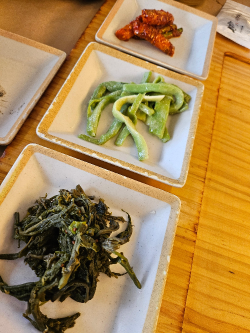 '산으로간고등어'는 메인 메뉴뿐만 아니라 밑반찬도 정말 훌륭했어요. 김치, 샐러드, 나물 등 정갈하면서도 맛깔스러운 반찬들이 다양하게 제공되었습니다. 특히 사진에 보이는 것처럼 말린 나물 반찬들은 일반 백반집에서 쉽게 맛볼 수 없는 특별함이 있었어요. 매콤달콤한 양념으로 무쳐낸 더덕무침(?) 같은 반찬이나 푸릇푸릇한 나물 무침 등 하나하나 정성이 느껴지는 맛이었습니다.